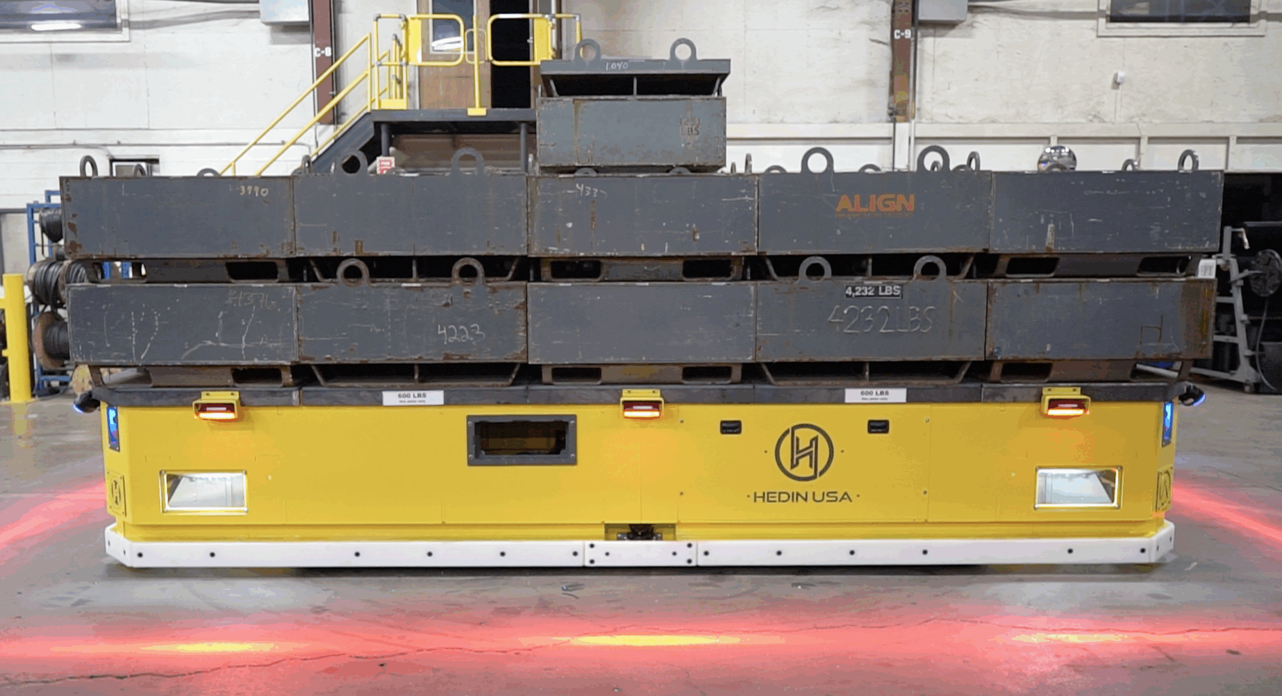 Align engineered a 130,000 lb capacity flatbed transporter with a wide wheelbase and multiple idler wheels to distribute floor loading so that no parts of the floor are damaged. Designed for remote control use with the potential AGV upgrades, the transporter integrated several safety options:Ā